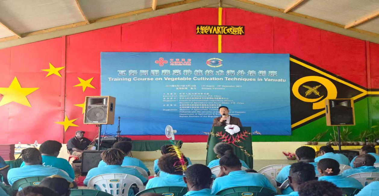2025年9月26日,由商务部主办、农业农村部国际交流服务中心承办的蔬菜种植技术海外培训班在瓦努阿图桑马省圆满结业。瓦农业部总司长图姆孔、桑马省政府副秘书长卡罗尔、驻瓦使馆参赞陈宗伟等出席结业仪式并致辞。瓦公务员委员会、桑马省政府以及参训学员等百余人参加结业仪式,共同观摩中瓦示范菜园。