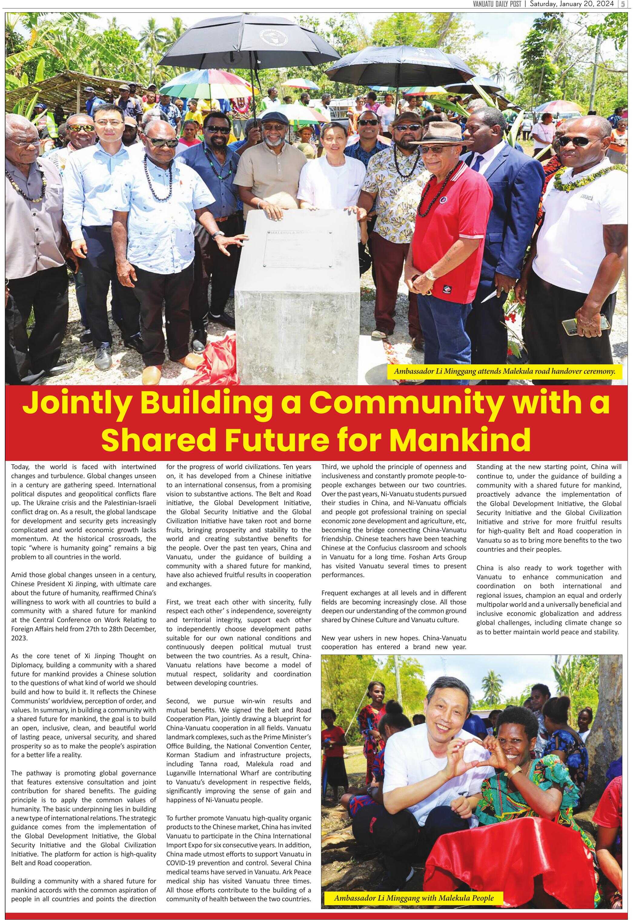 2024年1月20日,李名刚大使在瓦努阿图主流媒体《每日邮报》发表署名文章《携手构建人类命运共同体》,深入宣介构建人类命运共同体的科学体系,回顾10年来中瓦以构建人类命运共同体为指引取得的重大合作成果,务实合作取得的辉煌成就,并展望中瓦关系美好明天。全文如下: